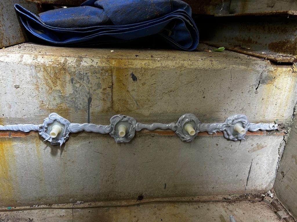 確認された亀裂に対し、低圧注入による止水処理を行うため、